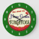 A funny gardener clock reading; Ask about my Home Grown Tomatoes in retro letters with vintage tomato art and white numbers on a green background. An original vintage look advertising sign for gardeners, cooks and tomato snobs. Click Customize It to add your name or message, change background colors and more.