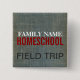 Vintage blue book cover background with white letters for your family name, red letters with the word "homeschool" and grey letters with the word "field trip." This button can be fully customized by you and it's also a template. This is the perfect button to have your kids wear on homeschool day trips to be identified by others.