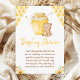 This cute and whimsical watercolor display shower enclosure card features an adorable bear leaning against a jar of honey, bees, honeycomb, floral arrangements and balloons. The text combines handwritten script and sans serif fonts for a stylish and modern look. This is perfect for a bee or bear themed baby shower.