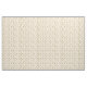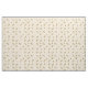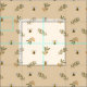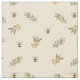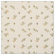 Pattern of honey bees and hexagons flying over a sandy, pastel almond background while gathering pollen from flowers growing on sprigs of leafy greenery.