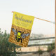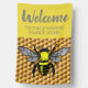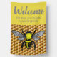 A honey bee Welcome house flag with a honeycomb background pattern. Personalize the name, add your company name, or remove.