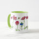 A pretty botanical mug featuring bright pink cosmos flowers, blue nigella and honey bees drawn in black ink and painted with watercolor. A nice mug for a gift for a friend!