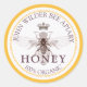 An elegant honey label featuring a beautiful ghosted double bee graphic logo in earthy brown and yellow gold, for a commercial honey beekeeping apiary.