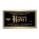 Honey is written in a decorative text with a small "honey drip" under the "H" and honeybee. 'Metallic' gold border around black label.