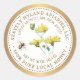 Round metallic gold honey label with gold text. Central design shows a honeybee pollinating a yellow dandelion wildflower. Write in your name, honey type, location, and net weight.. Common honey net weight conversions: 8oz (227g), 12oz (340g), 16oz (454g), 32oz (907g), 5lb (2.27kg).