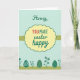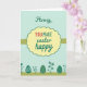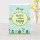 Designed with a calm aqua-mint background, this card centers on a large scalloped, cloud-like shape in soft buttery yellow that draws your eyes right in. Above it, the word “Honey” sits near the top in flowing green lettering, setting a close, affectionate tone like a sweet nickname between friends. Inside the yellow shape, “YOU MAKE” appears in strong crimson letters, followed by “easter happy” in matching green flowing lettering, creating a cozy contrast. A muted olive-green band runs horizontally behind the central shape, giving the layout a steady, grounded look. Along the bottom edge, slim-stemmed flowers and small blooms mingle with three deep emerald egg shapes, adding a spring garden feel 🌷. The eggs show different patterns—one with horizontal stripes and small dots, and two with a tight crosshatch lattice—like little gifts exchanged with a knowing smile 🐰. The florals curl around the eggs in simple linework, with green leaves and delicate petals framing the lower border.