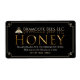Contact info, address and honey net weight is written in the lower part of oval label under the word "HONEY" which takes center field in a chiseled gold metallic font.