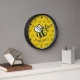 Smiling flying bee cartoon over seamless bee-hive background. Custom text.
