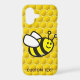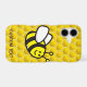 Smiling flying bee cartoon over seamless bee-hive background. Custom text.
