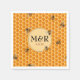 Honeybees over a golden honeycomb pattern to create napkins for a wedding reception or rehearsal dinner, personalized with monogram initials for the bride and groom with an ampersand or plus sign, and the event date in a round frame.