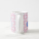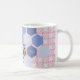 What can be better than to sip your morning coffee with your favorite couple's mug? With a honeycomb pattern of blue-toned shapes that carry editable text and photos on an abstract pink and blue pattern. Write your initials, date of marriage, or the beginning of your relationship, and add your photos. This is the perfect wedding gift or anniversary gift for loving couples.
