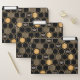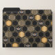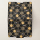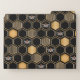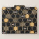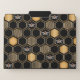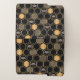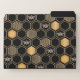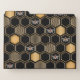 This contemporary design features a geometric gold color beehive pattern, bumblebees, and a black color background.
