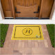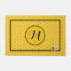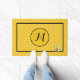 This doormat features a yellow and white honeycomb pattern. It has a black border and an area in the center for a monogram. In the lower right corner there's a bumble bee.