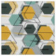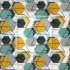 Honeycombs. Abstract geometric pattern. Gray, mustard, turquoise figures on white.