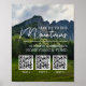 This alternative wedding registry Honeymoon Fund sign features the caption "Take us to the mountains" in modern white fonts over a mountain landscape picture background. Easily change the background photo with one of your choice, and add up to 3 QR Codes to invite your guests to make a contribution to your dream vacation by sending cash donations to your payment app with their mobile phones.