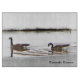 On a gray spring day in Alaska two Canada Geese, often referred to as “honkers,” swim in a body of water still partially choked with ice. Customizable text reading "Canada Goose" also appears. The Canada Goose, Branta canadensis, has a black head and neck, white patches on the face, and a brownish-gray body. The black head and neck with white "chinstrap" distinguish the Canada Goose from all other goose species, with the exception of the Barnacle Goose, but the latter has a black breast, and also gray, rather than brownish, body plumage. The Canada Goose ranges 30 to 43 inches in length and has a 50 to 73 inch wingspan. Males usually weigh 7.1–14 lbs and can be very aggressive in defending territory. The female looks virtually identical but is slightly lighter at 5.5–12 lbs, and has a different honk. The life span in the wild of geese that survive to adulthood ranges 10–24 years Canada Geese are native to North America. They breed in Canada and the northern United States in a variety of habitats. Nests are usually located in an elevated area near water such as streams, lakes, ponds and sometimes on a beaver lodge. Eggs are laid in a shallow depression lined with plant material and down. In recent years, Canada Goose populations in some areas have grown substantially, so much so that many consider them pests for their droppings, bacteria in their droppings, noise, and confrontational behavior. This problem is partially due to the removal of natural predators and an abundance of safe, man-made bodies of water such as found on golf courses, in public parks and beaches, and in planned communities. Due in part to the interbreeding of various migratory subspecies with the introduced non-migratory Giant subspecies, Canada Geese are frequently a year-around feature of such urban environments. Canada Geese have reached northern Europe naturally, as has been proved by ringing recoveries. The birds are of at least the subspecies parvipes, and possibly others. Canada Geese are also found naturally on the Kamchatka Peninsula in eastern Siberia, eastern China, and throughout Japan. Like most geese, the Canada Goose is migratory with the wintering range being most of the United States. Honking from large groups of Canada Geese flying in V-shaped formation signal the transitions into spring and autumn. In some areas, migration routes have changed due to changes in habitat and food sources. In mild climates from California to the Great Lakes, some of the population has become non-migratory due to adequate winter food supply and a lack of former predators. Canada Geese are primarily herbivores, although they sometimes eat small insects and fish. Their diet includes green vegetation and grains. The Canada Goose eats a variety of grasses when on land. It feeds by grasping a blade of grass with the bill, then tearing it with a jerk of the head. The Canada Goose also eats grains such as wheat, beans, rice, and corn when they are available. In the water, it feeds from silt at the bottom of the body of water. It also feeds on aquatic plants, such as seaweeds. In urban cities, they are also known to pick food out of garbage bins. Adult geese are often seen leading their goslings in a line, usually with one parent at the front, and the other at the back. While protecting their goslings, parents often violently chase away nearby creatures, from small blackbirds to lone humans that approach, after warning them by giving off a hissing sound and will then attack with bites and slaps of the wings if the threat does not retreat or has seized a gosling. Most of the species that prey on eggs will also take a gosling. Although parents are hostile to unfamiliar geese, they may form groups of a number of goslings and a few adults, called crèches.