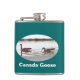 On a gray spring day in Alaska two Canada Geese, often referred to as “honkers,” swim in a body of water still partially choked with ice. Text reading "Canada Goose" also appears.. The Canada Goose, Branta canadensis, has a black head and neck, white patches on the face, and a brownish-gray body. The black head and neck with white "chinstrap" distinguish the Canada Goose from all other goose species, with the exception of the Barnacle Goose, but the latter has a black breast, and also gray, rather than brownish, body plumage. The Canada Goose ranges 30 to 43 inches in length and has a 50 to 73 inch wingspan. Males usually weigh 7.1–14 lbs and can be very aggressive in defending territory. The female looks virtually identical but is slightly lighter at 5.5–12 lbs, and has a different honk. The life span in the wild of geese that survive to adulthood ranges 10–24 years Canada Geese are native to North America. They breed in Canada and the northern United States in a variety of habitats. Nests are usually located in an elevated area near water such as streams, lakes, ponds and sometimes on a beaver lodge. Eggs are laid in a shallow depression lined with plant material and down. In recent years, Canada Goose populations in some areas have grown substantially, so much so that many consider them pests for their droppings, bacteria in their droppings, noise, and confrontational behavior. This problem is partially due to the removal of natural predators and an abundance of safe, man-made bodies of water such as found on golf courses, in public parks and beaches, and in planned communities. Due in part to the interbreeding of various migratory subspecies with the introduced non-migratory Giant subspecies, Canada Geese are frequently a year-around feature of such urban environments. Canada Geese have reached northern Europe naturally, as has been proved by ringing recoveries. The birds are of at least the subspecies parvipes, and possibly others. Canada Geese are also found naturally on the Kamchatka Peninsula in eastern Siberia, eastern China, and throughout Japan. Like most geese, the Canada Goose is migratory with the wintering range being most of the United States. Honking from large groups of Canada Geese flying in V-shaped formation signal the transitions into spring and autumn. In some areas, migration routes have changed due to changes in habitat and food sources. In mild climates from California to the Great Lakes, some of the population has become non-migratory due to adequate winter food supply and a lack of former predators. Canada Geese are primarily herbivores, although they sometimes eat small insects and fish. Their diet includes green vegetation and grains. The Canada Goose eats a variety of grasses when on land. It feeds by grasping a blade of grass with the bill, then tearing it with a jerk of the head. The Canada Goose also eats grains such as wheat, beans, rice, and corn when they are available. In the water, it feeds from silt at the bottom of the body of water. It also feeds on aquatic plants, such as seaweeds. In urban cities, they are also known to pick food out of garbage bins. Adult geese are often seen leading their goslings in a line, usually with one parent at the front, and the other at the back. While protecting their goslings, parents often violently chase away nearby creatures, from small blackbirds to lone humans that approach, after warning them by giving off a hissing sound and will then attack with bites and slaps of the wings if the threat does not retreat or has seized a gosling. Most of the species that prey on eggs will also take a gosling. Although parents are hostile to unfamiliar geese, they may form groups of a number of goslings and a few adults, called crèches.