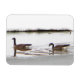 On a gray spring day in Alaska two Canada Geese, often referred to as “honkers,” swim in a body of water still partially choked with ice. This image is from a photograph taken by the artist. The Canada Goose, Branta canadensis, has a black head and neck, white patches on the face, and a brownish-gray body. The black head and neck with white "chinstrap" distinguish the Canada Goose from all other goose species, with the exception of the Barnacle Goose, but the latter has a black breast, and also gray, rather than brownish, body plumage. The Canada Goose ranges 30 to 43 inches in length and has a 50 to 73 inch wingspan. Males usually weigh 7.1–14 lbs and can be very aggressive in defending territory. The female looks virtually identical but is slightly lighter at 5.5–12 lbs, and has a different honk. The life span in the wild of geese that survive to adulthood ranges 10–24 years Canada Geese are native to North America. They breed in Canada and the northern United States in a variety of habitats. Nests are usually located in an elevated area near water such as streams, lakes, ponds and sometimes on a beaver lodge. Eggs are laid in a shallow depression lined with plant material and down. In recent years, Canada Goose populations in some areas have grown substantially, so much so that many consider them pests for their droppings, bacteria in their droppings, noise, and confrontational behavior. This problem is partially due to the removal of natural predators and an abundance of safe, man-made bodies of water such as found on golf courses, in public parks and beaches, and in planned communities. Due in part to the interbreeding of various migratory subspecies with the introduced non-migratory Giant subspecies, Canada Geese are frequently a year-around feature of such urban environments. Canada Geese have reached northern Europe naturally, as has been proved by ringing recoveries. The birds are of at least the subspecies parvipes, and possibly others. Canada Geese are also found naturally on the Kamchatka Peninsula in eastern Siberia, eastern China, and throughout Japan. Like most geese, the Canada Goose is migratory with the wintering range being most of the United States. Honking from large groups of Canada Geese flying in V-shaped formation signal the transitions into spring and autumn. In some areas, migration routes have changed due to changes in habitat and food sources. In mild climates from California to the Great Lakes, some of the population has become non-migratory due to adequate winter food supply and a lack of former predators. Canada Geese are primarily herbivores, although they sometimes eat small insects and fish. Their diet includes green vegetation and grains. The Canada Goose eats a variety of grasses when on land. It feeds by grasping a blade of grass with the bill, then tearing it with a jerk of the head. The Canada Goose also eats grains such as wheat, beans, rice, and corn when they are available. In the water, it feeds from silt at the bottom of the body of water. It also feeds on aquatic plants, such as seaweeds. In urban cities, they are also known to pick food out of garbage bins. Adult geese are often seen leading their goslings in a line, usually with one parent at the front, and the other at the back. While protecting their goslings, parents often violently chase away nearby creatures, from small blackbirds to lone humans that approach, after warning them by giving off a hissing sound and will then attack with bites and slaps of the wings if the threat does not retreat or has seized a gosling. Most of the species that prey on eggs will also take a gosling. Although parents are hostile to unfamiliar geese, they may form groups of a number of goslings and a few adults, called crèches.