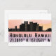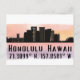 Postcard features Honolulu Hawaii city skyline silhouette with watercolor splash and latitude & longitude map coordinates