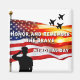 A solider salutes the American flag with the sunset reflecting through. Airplanes flying over the flag, and the messages of “Honor and Remember the Brave” and “Memorial Day” to honor the fallen heroes who served the country.