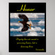 A bold backdrop highlights a commanding bald eagle, its sharp beak and piercing gaze symbolizing courage and nobility. The majestic bird soars freely, embodying dignity and strength. At the top, "Honor" is elegantly inscribed in bold yellow cursive, exuding reverence. Below, Aristotle's timeless quote — "Dignity does not consist in possessing honors, but in deserving them" — is displayed in a readable serif font, thoughtfully positioned above his name. This harmonious composition celebrates wisdom, strength, and the regal beauty of nature’s most vigilant guardian.