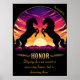 Set against a breathtaking sunset backdrop, two horses rear up in dramatic silhouette, their powerful forms outlined against a sky painted with vibrant gradients of orange, pink, and purple. The horses’ dynamic poses radiate strength and grace, contrasting against the fiery horizon. At the top, the word "Honor" is elegantly written in eye-catching yellow cursive, symbolizing dignity and importance. Below, Aristotle’s quote — "Dignity does not consist in possessing honors, but in deserving them" — is displayed in a matching yellow font, ensuring clarity against the darkening sky. A solid black border frames this striking scene, creating a polished, powerful composition.