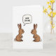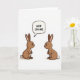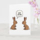 On the front of the card two simple bunny figures face each other in profile on a plain white background, their warm brown bodies set up like a mirrored pair 🐰. Each has soft pink inner ears, tiny black eyes, a small red button nose, and a little white tail, and their close spacing suggests a friendly, slightly flirty invitation. Their calm expressions and the way their noses nearly point toward one another create a tender, almost teasing connection. Above the bunny on the left, a rounded speech bubble appears, outlined in black and angled toward its head. Inside the bubble, the text “HOP ON ME” is placed in uppercase black lettering, centered and easy to read. With no extra scenery, the empty space keeps all attention on the two characters and their shared moment 🐇. The only accents beyond brown are the pink ears, the red noses, and the small white tails against the bright white backdrop.