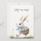 Invite your guests to a whimsical spring celebration with this double-sided "Hop on over" Easter invitation. The front features a soft watercolor illustration of a white bunny in a blue checkered sweater, joyfully carrying a basket of speckled eggs. The backside is dedicated to your party details, offering a clear and organized layout for your brunch or egg hunt information. It is a charming and high-quality choice for a family-friendly holiday gathering.