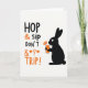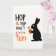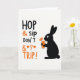 This card features a mostly white background with a dark, long-eared rabbit-like figure on the right, shown in profile as it calmly holds a tall glass of fizzy orange drink 🐰. A single white eye peeks out, giving the character a shy, friendly look, like it’s sharing a quiet joke with someone just off to the side. On the left, the text is arranged in stacked lines with a mix of black and bright orange letters, reading “HOP & sip DON’T” and then finishing with “TRIP!” in a strong, attention-grabbing layout. Between parts of the message, small decorative marks like ampersands, stars, and a tiny lightbulb-style icon add a flirty, wink-and-nudge rhythm without crowding the space 🌷. The limited palette—black shapes and citrus orange accents against white—keeps the scene simple while still feeling energetic. The drink is topped with a citrus slice near the rim, and small bubble-like dots inside the glass suggest sparkle and motion. The rabbit-like silhouette remains solid and dark, with the bright orange drink standing out beside the black-and-orange lettering.