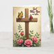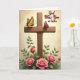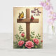 This card features a rustic wooden cross at the center, with visible grain lines that give it an aged, sturdy look. Resting side by side on the crossbeam are two butterflies, their wings shaded golden yellow and deep orange-red with fine black markings, angled as if leaning toward each other in a gentle, companionable pose 🐇. At the base, a cluster of pink roses—some fully open, others still in bud—spills outward through leafy green stems, adding a soft touch of romance like a bouquet placed with care 🌷. The background is a creamy off-white that warms into light beige, creating a calm glow around the wood and flowers. Light highlights the velvety rose petals and the thin, delicate edges of the butterfly wings, keeping the scene tender and quiet. In the upper right corner, a short Easter greeting appears in flowing lettering, set in a darker warm tone that stands out against the pale backdrop. The cross sits slightly forward in the composition, while the roses form a curved border along the bottom and the butterflies hover neatly along the horizontal beam.