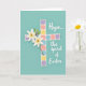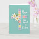 This card features a stylized cross centered on an aquamarine background, built from textured rectangular pieces in soft spring pastels like lavender, pink, sky blue, and buttercup yellow. The mosaic look gives the shapes a gentle, close-together feel, like parts leaning in as one. On the left arm of the cross sit two star-shaped blossoms with white petals that appear softly lit, suggesting a tender, caring touch. Their green stems and small buds curve upward, and the golden-yellow centers echo the warm tones in the cross. To the right side, the text “Hope… the spirit of Easter” appears in white, placed at mid-height so it balances the cross without crowding it. The lighting stays soft and even, with pastel colors that keep the scene calm while still feeling affectionate and welcoming 🌷. Near the blossoms, tiny highlights make the petals look gently glowing 🐇.