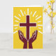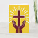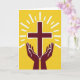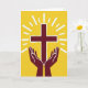 Designed with a minimalist graphic style, the card centers on a maroon symbol made from two intersecting bars, held gently above a pair of cupped hands in the same deep red. A thin white outline traces the edges of the symbol and the hands, making them stand out crisply against a golden-yellow background. From behind the center, white rays fan outward like sunlight, giving the scene a radiant, uplifted look. The hands sit symmetrically at the lower middle, angled upward as if offering steady care, like a quiet promise between close friends. Near the top, a short greeting can be placed in small white letters so it stays readable over the bright field, with a second line in maroon tucked beneath it for balance. A tiny 🌷 or 🐇 can sit near the lower corner as a soft accent without crowding the main image. The overall layout is flat and graphic, with the maroon shapes centered and the white rays spreading evenly across the yellow backdrop.