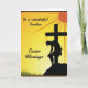 This design shows a glowing gradient sky shifting from sunny yellow near the center into warm orange toward the upper right, with a stylized sun sending long rays across the scene. In the middle stands a tall, upright wooden structure in dark silhouette, giving the layout a quiet, reverent focus. Near its base, a single kneeling figure bows their head, and the curved shoulders suggest a tender, intimate moment like someone pausing for a loved one or close friend. Along the bottom edge, simplified green plants form a soft ground line that adds a touch of springtime 🌷. A short seasonal greeting appears across the brighter area of the sky in flowing cursive-style lettering, set in a darker tone for contrast. Smaller words of appreciation sit nearby, spaced lightly so the warm background still feels open and airy. The sun’s rays fan outward behind the silhouettes, while the green foliage stays clustered along the lower border 🐇.