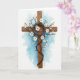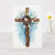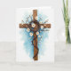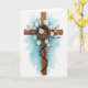 This design shows a large wooden cross with visible grain and sturdy beams, set against a soft wash of sky blue fading into white. At the center, a dark wreath of sharp thorns wraps the crossing point, its rough texture standing out in the gentle light. From within and around the thorns, slender branches curl outward like an embracing gesture, suggesting closeness through their intertwined lines. Small daisy-like flowers scatter along the branches, with white petals and warm yellow centers, shown as buds, half-open blooms, and full blossoms 🌷. The lighting stays diffused and calm, highlighting the contrast between the thorn points, the smoother wood, and the fragile petals. Near the upper portion, simple lettering in a muted gray sits lightly on the airy background, leaving plenty of open space around the cross 🐇. The background remains minimal, with the blue-to-white watercolor fade framing the cross and blossoms without any extra objects.