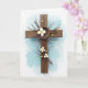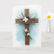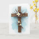 This design shows a dark wooden cross centered on a soft, light blue background with a cloudy wash, creating a quiet, intimate setting. A circular wreath of twisted thorn branches sits at the crossing point, its rough texture standing out against the smooth wood. Small white blossoms with sunny yellow centers are tucked among the thorns, like gentle gestures of care between tougher edges. One larger bloom rests near the top curve of the wreath, drawing your eye upward, while a small cluster trails down the lower arm with a few green buds suggesting new growth 🌷. The lighting is soft and even, revealing the grain of the wood, the sharp turns of the branches, and the velvety petals without harsh shadows. A short greeting in white lettering sits near the top, and a second line in a lighter gray appears near the bottom, leaving the center image unobstructed 🐇. Along the lower vertical arm, the blossoms cascade in a loose line, with tiny buds spaced between petals against the dark wood.