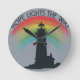 "Hope Lights the Way" features a lighthouse and a rainbow. The lighthouse is a symbol of hope, and the rainbow is a reminder that even in the darkest of times, there is always light. The text "Hope Lights the Way" is written in a looping cursive font around the clock face. The hands are black and the clock face itself is white.The wall clock you sent me has a lighthouse design in the center, with the words “Hope Lights The Way” written in a circle around it. The clock hands are black and the time is set to 3:15. The lighthouse is white with a red roof and black windows. There is a rainbow arcing out from the base of the lighthouse.Hope Lights the Way” written in a circle around the edge. In the center of the clock face is a lighthouse illustration with a rainbow arcing out from it. The lighthouse is a symbol of hope and guidance, and the rainbow is a symbol of promise and new beginnings. The clock hands are black and appear to be made of metal.