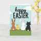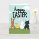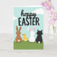 This greeting card features a pale blue sky across the top, with soft cloud shapes drifting near the upper edge. Centered in that open space, the word “hoppy” appears in black, rounded lettering, with “EASTER” set just below it in black uppercase text. Below the message, a gently rolling green hillside stretches across the scene like a shared lookout point. Four simple animal figures stand close together from behind, their closeness suggesting a quiet friendship as they face the same view 🐰. From left to right there is a warm brown hare, a sunny yellow duckling with an orange beak, a white hare with pink inner ears, and a smooth black cat with small whisker marks 🐇. Each animal has a small fluffy white tail tuft that repeats across the lineup, tying them together visually. The lower half stays mostly green with the animals in a neat row, while the pale blue sky above leaves plenty of breathing room around the black text.