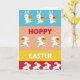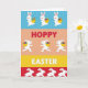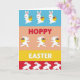 This design shows a multi-paneled Easter scene divided into four horizontal color bands in soft azure, peach, sunny yellow, and deep red, creating a steady rhythm from top to bottom 🌷. In the top blue section, three small white rabbits 🐰 stand close together with warm yellow baskets filled with bright egg shapes and tiny orange blossoms, and their gentle, sideward glances feel like a quiet moment shared between friends. Across the middle, the word “HOPPY” appears in textured deep red letters placed over the peach band, while “EASTER” sits in crisp white letters centered on the yellow band. Between these text bands, an orange-toned strip shows three more white rabbits mid-stride, leaning forward as they hurry along with matching baskets, as if delivering treats to someone they care about. The repeated baskets and coordinated poses suggest companionship, like a small team moving in sync. At the bottom, a deep red panel shows four little white rabbits crouched low and relaxed, their bodies angled toward one another as if settling in together after the dash. Small orange blossoms and colorful egg shapes peek out from the baskets against the pastel bands.