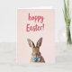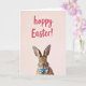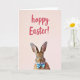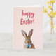 This card features a vertical layout with a furry bunny peeking up from the lower area, its face and the tops of its long ears filling the foreground like it’s leaning in for a sweet hello 🐰. The bunny’s golden-brown fur is softly shaded with gentle stripes, and the lighting makes the texture look plush and touchable. Its dark, glossy eyes are turned upward with a tender, curious look that feels like a quiet moment shared between close friends. Under its chin sits a neatly tied bow tie in a blue-and-white check pattern, adding a dressed-up touch without taking attention away from the face. Near the top, the words “hoppy Easter!” appear in a flowing handwritten-style font, set in warm red that stands out clearly. The background is a blush-pink field that keeps the scene airy and springlike 🌷. The red greeting sits above the bunny’s upright ears against the pink backdrop.