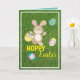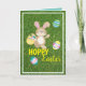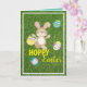 This whimsical brown rabbit is hopping along, collecting colorful eggs. You can customize the text on the inside.