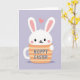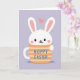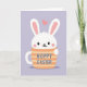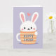 This card shows a sweet white rabbit peeking out from inside a large mug, with simple oval eyes, a small curved smile, and rosy cheeks that give it a tender, friendly look 🐰. Its long ears stand up with soft pink inner details, as if it’s leaning in to greet someone close. A tiny pink heart floats just above its head, adding a quiet romantic note like a warm glance shared between friends. The mug is decorated with horizontal stripes in warm orange tones, and a sturdy white handle sits on the left side. Across the front of the mug, the text “HOPPY EASTER” appears in dark gray, centered and easy to read. The background is a muted lavender field that keeps the focus on the rabbit and the cozy cup, with a gentle spring feel 🌷. The striped mug sits against the smooth lavender backdrop, with the small pink heart hovering above the rabbit’s ears.