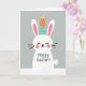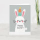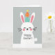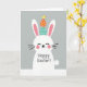 This card shows a stylized white rabbit with long upright ears, their inner sections tinted soft pink, leaning in as if guarding a small stack of Easter treasures 🐰. Between the ears sit two decorated eggs, with a warm orange egg covered in small white dots balanced on top of a cool turquoise egg marked with short white dashes. A tiny yellow bird perches at the very top, adding a sweet, close-knit feel like friends huddling together for a photo 🌷. The rabbit’s eyes are closed in gentle upward curves, with rosy pink cheek circles and a small black nose that reads like a quiet smile. Thin black whiskers fan outward, and a small fluffy white tail peeks from the lower right edge of the rabbit’s body. The background is a flat light grey, keeping the white fur and the egg colors easy to notice without distraction. The words “Hoppy Easter!” appear prominently on the design in a clear, friendly style, set in a dark tone that stands out against the pale background. The orange egg sits directly above the turquoise one, and the tiny yellow bird is centered at the top of the stack.