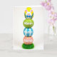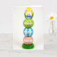 The front design shows a tall vertical stack of round shapes centered on a white background, like a cheerful totem rising upward. At the top sits a bright yellow egg shape featuring a cute bunny face with long upright ears lined in pink, a tiny red nose, rosy cheeks, and a small blue bow tie 🐰. Small clusters of stylized blue flowers tuck around the bunny’s face, giving it a sweet, affectionate look, as if it’s posing for someone special. Just below, a smooth lime-green sphere carries the word “HOPPY” in white, simple sans-serif letters placed across the middle. The next sphere repeats “HOPPY” in the same white lettering, set over alternating light and medium blue stripes that wrap around the round surface. At the bottom, a soft pink sphere sprinkled with bright yellow dots displays “EASTER” in matching white letters, centered and easy to read 🌷. The stack rests on a richly green, grass-like textured base, with crisp lighting and no harsh shadows against the white space.