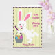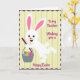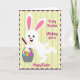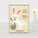 This card features a bright digital illustration of a white bunny character 🐰, shown mid-skip with a wide smile and lively eyes that seem to glance outward as if inviting a friendly hello. Its long ears stand tall with soft pink inside, and a small fluffy tail peeks out behind. The bunny holds a simple gray basket close to its chest in a cozy, caring pose, like it’s bringing a small gift to someone special. Inside the basket sit five decorated eggs, each with different patterns such as stripes, zigzags, dots, and wavy lines in blue, green, yellow, red, and magenta 🌷. A deep purple scalloped border frames the scene, surrounding a pale lime-green background with faint vertical stripes that keep the focus on the character. Magenta lettering is placed to the right of the bunny and reads, “To my Teacher Wishing you a Hoppy Easter,” with the words stacked in short lines for easy reading. The eggs show crisp little details, including alternating bands and tiny dot trails, nestled together at the top of the basket.