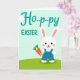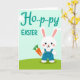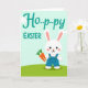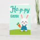 This card features a white bunny with tall upright ears and soft rounded shapes, standing front and center with a friendly smile and rosy cheeks 🐰. It wears bright blue overalls with small yellow fasteners, and the neat outfit gives it a sweet, approachable look, like it’s posing for a photo to share with someone close. In its paws, the bunny holds two orange carrots with leafy green tops, angled inward as if offering them to a friend. A gentle hill of green grass curves across the bottom, meeting a pale blue sky that feels calm and open. Near the top, teal lettering reads “Hoppy Easter,” set in a flowing, hand-drawn style with small dot details that add a soft, affectionate touch 🌷. The words sit above the bunny’s ears, centered and easy to spot without crowding the scene. A few fluffy white clouds rest along the upper edges of the sky.