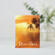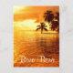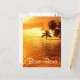 Postcard with a horizontal palm tree hanging over the water of the pacific ocean during sunset on a tropical island with the text: 'Bora Bora'.