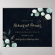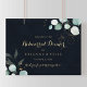 This horizontal rehearsal dinner welcome blue sign is perfect for a simple wedding rehearsal. This artistic design features hand-drawn gold floral and watercolor eucalyptus green foliage in a dark blue background, inspiring natural beauty.
