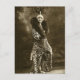 Vintage photograph of a young woman in a combination of hat and coat that are perfectly horrendous. The hat has a cap that fits the entire head with a stalk and a curving and dangling atrocity of a hat.. The coat is some kind of animal fur with fluffy black fur surrounding the collar. The bottom has an uneven edge which looks like it could be the untrimmed edge of the original animal fur