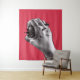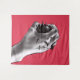 Horror art tapestry featuring a creepy digital illustration of a stabbed hand squeezing a spiked ball, suffering pain from its sharp thorns cutting through the skin. This wicked artwork has a color scheme in grey, red and black, inspired by gothic art.