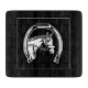 An image of a black and white scratchboard illustration of a Thoroughbred horse wearing a bridle with a shadow roll within a horseshoe. This drawing was etched in india ink on cardboard.
